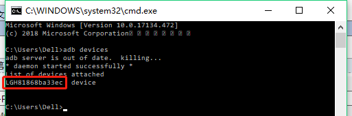 手机通过USB线连接电脑,打开开发者模式,打开USB调试功能,使用adb命令adb devices查看设备名称。