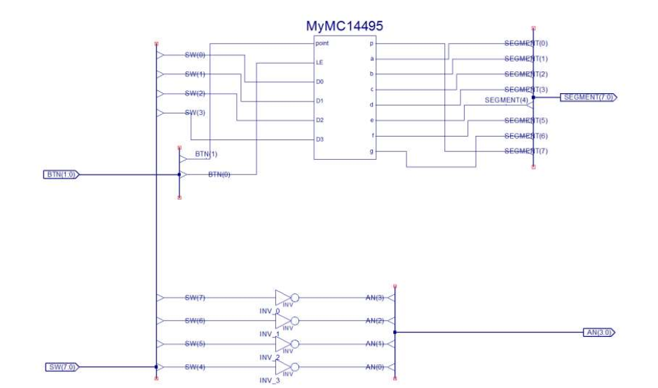 整个逻辑图如上图所示,通过AN0~AN3控制四个七段数码管的亮灭,MyMC14495负责将输入的二进制数转化为可以显示在数码管上的信号。