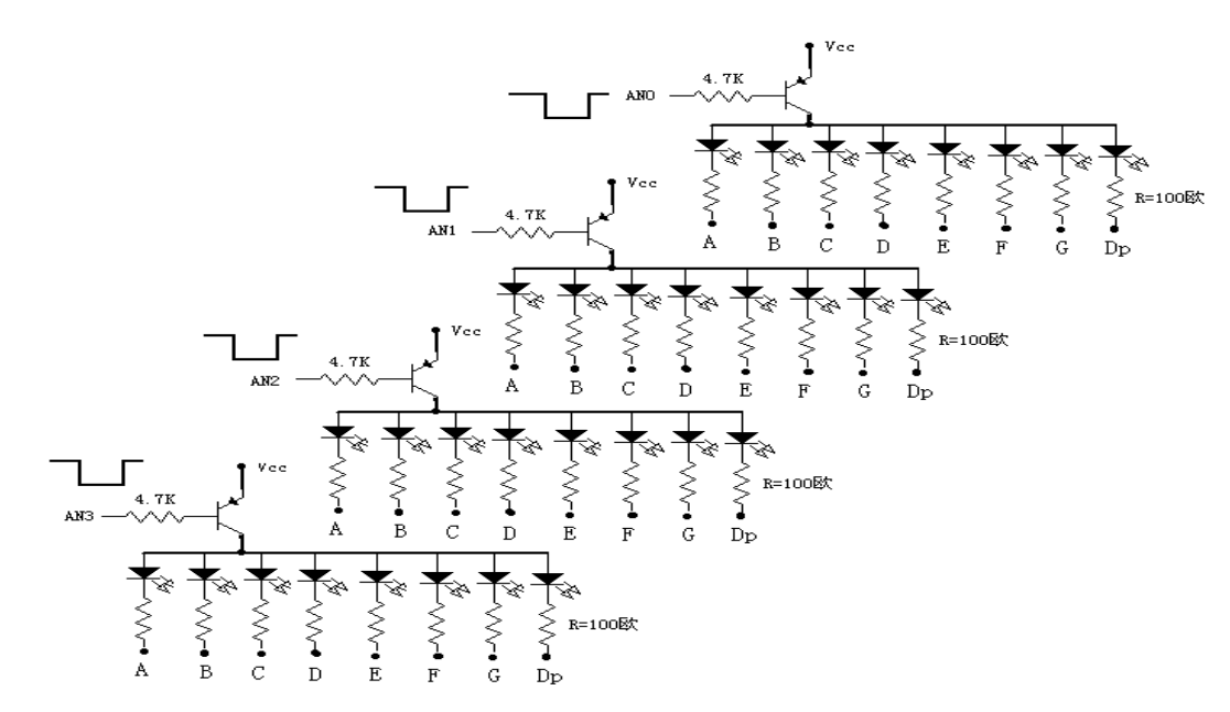 这里有点特别的地方。动态扫描显示,也叫时分复用显示,利用人眼视觉残留,一个7段码译码电路分时为每个7段码提供译码。