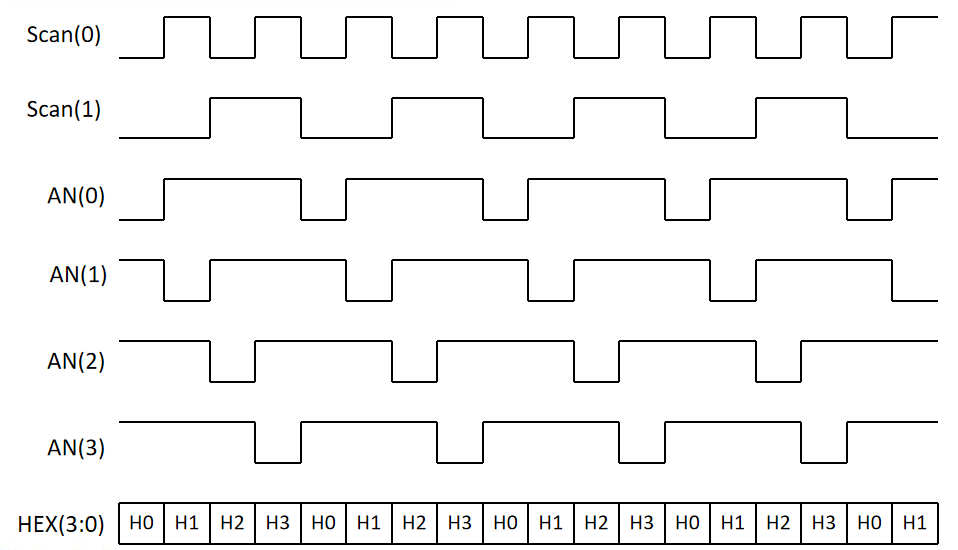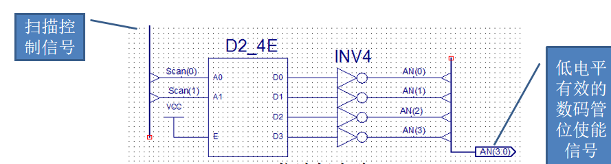 这样,通过这个选择器选择出来要输出的数,在输入到上面的那个实验的电路中就可以显示出来了。至于防止四个七段数码管都输出同一个数字,就是通过scan信号控制AN不断变化,每次保证只显示一个。当然也可以异步控制AN使某一个数码管不显示。用scan信号控制AN的方式有两种,在下面用图示给出。
