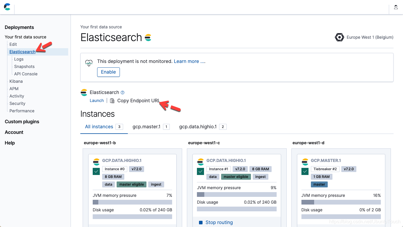 - 在上面的文件中,修改参数主机和密码,以匹配您的 Elasticsearch 服务端点和 Elastic 用户密码。在 Elastic Cloud 中,您可以从部署页的详细信息中获取 Elasticsearch 端点 URL(复制端点 URL)。