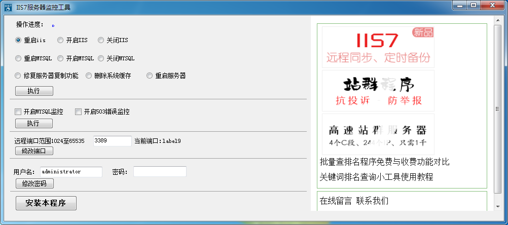 IIS7服务器监控工具该软件风格简约,操作简单,删除系统缓存,重启服务器,修改服务器账号密码,修复服务器复制功能等,也可以一键开启关闭MYSQL和503错误的监控,省去了繁琐的操作步骤,一键完成。也可以直接修改远程端口范围,省去繁琐步骤。