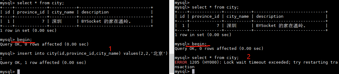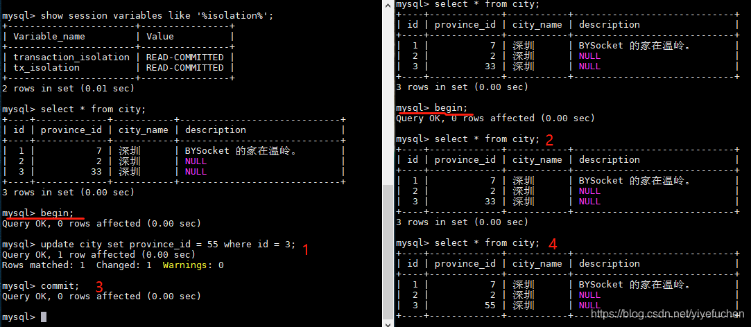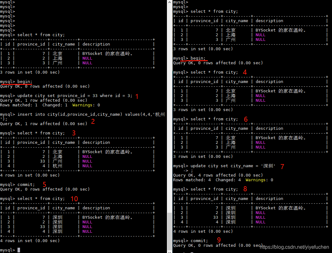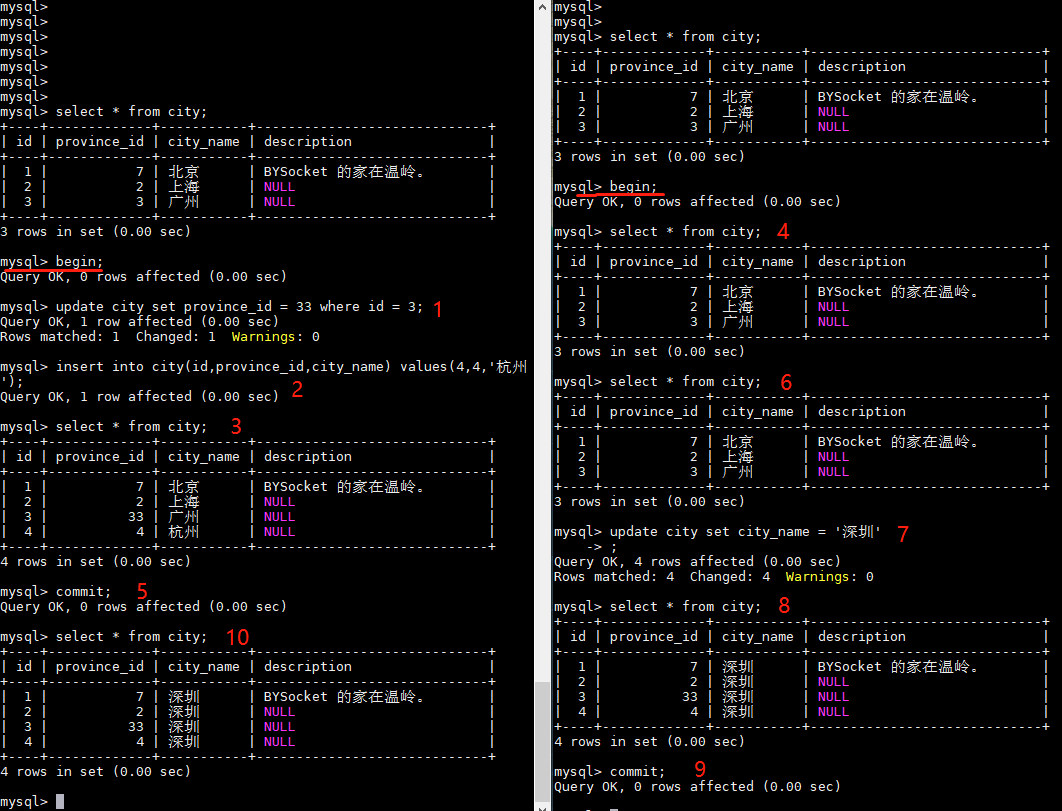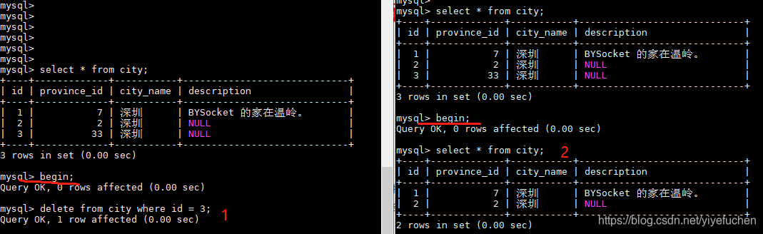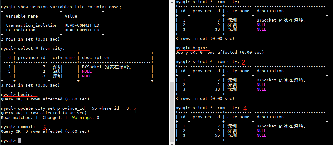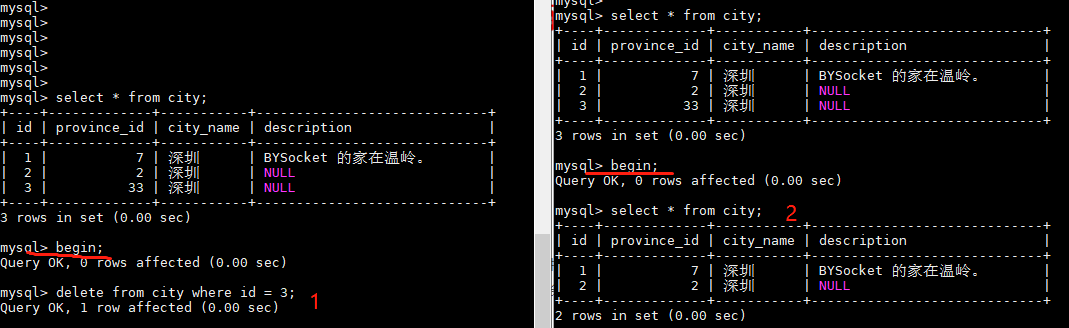 会话2查询,发现第三条数据的province_id被更新为33,多了一条数据,所有数据的city_name都更新为"深圳" (8)