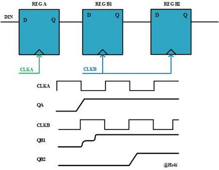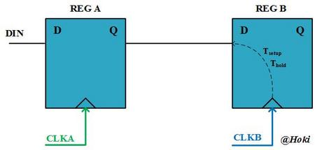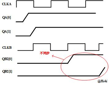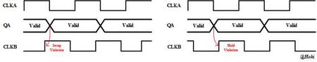 首先讲解一下如果不进行跨时钟域处理,会出现什么问题呢?如图1所示路径,QA属于CLKA时钟域的数据输出,另一个时钟CLKB去捕获节点REG A的输出QA,假定CLKA与CLKB是异步时钟,它们之间的相位并不固定,因此捕获过程中可能会出现建立冲突(setup violation)和保持冲突(hold violation),如图2所示,左右分别为发生建立冲突和保持冲突的情况。