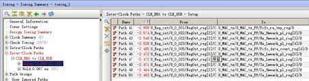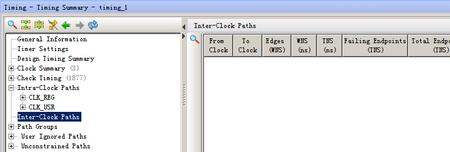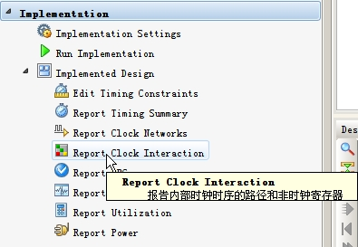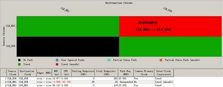 设计经过综合实现后,在Implementation中点击Report Clock Interaction(见图7),得到设计中所有时钟的交互情况,如图8所示,共有两个时钟:CLK_REG和CLK_USR,红色区域表示Timed(unsafe),说明两个时钟间有时序路径。