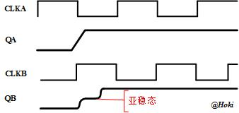 当冲突出现时(我感觉整个人都不好了),会发生什么事情呢?在发生建立冲突或者保持冲突,捕获节点(REG B)会处于一个不定的状态,正常的状态是高电平或者低电平,而此时的状态停留在高电平和低电平的中间,无效的电平X,称这个状态为亚稳态。如图3所示,捕获节点输出保持在亚稳态,可能在整个时钟周期内都保持在亚稳态,由于不正确的状态,其后连接的逻辑在功能实现上就会出现问题,比如一个判断信号上升沿的逻辑,通常判断D == HIGH && D_PREV == LOW(D为信号当前电平状态,D_PREV为信号上个时钟的电平状态)是否成立,而发生亚稳态时则D_PREV == X,这个上升沿将会错过。因此,加入跨时钟域处理设计是必须的。