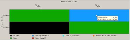 添加完约束后,时序报告中Inter-Clock Paths没显示有路径,并且没有未收敛的时序路径,如图12所示,Clock Interaction中原先红色区域变成了蓝色(User Ignored Paths),可以确认约束生效。