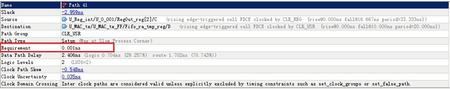 可以发现在图8底部时序分析的结果,有红色报警说明有路径时序未收敛,打开时序分析报告(见图9),source clock是CLK_REG,destination clock是CLK_USR,说明是一条跨时钟域路径,其中Requirement只有0.001ns,显然对跨时钟域路径的分析不合理,因此通常在保证设计者处理完成后,添加时序约束,是Vivado忽略对跨时钟域路径进行时序分析。