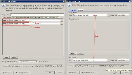 Set Clock Group和Set False Path的区别是,前者设置了双向(CLKA-TO-CLKB和CLKB-TO-CLKA)的路径,而后者只设置单向(CLKA-TO-CLKB或者CLKB-TO-CLKA)的路径,此例中因为只有单向区域有路径交互,因此使用Set False Path即可。