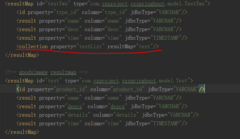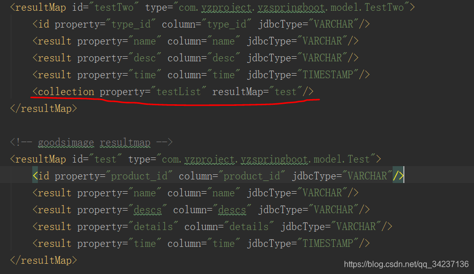有些时候,在查询数据的时候,会出现嵌套的类型,比如一个object里面有一个list,在表设计的时候,设计成了,两个表格,关系是一对多的一个关系,在查询的时候想多个的数据都查询出来,比如如下类型,这样通过一个sql语句直接查询出来。