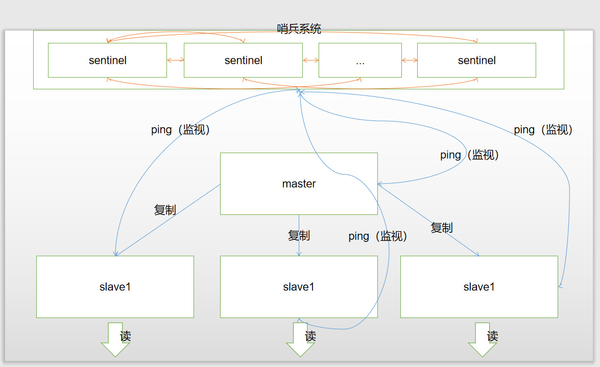- 每个哨兵(sentinel)进程以每秒一次的频率向所有主服务器(master)、从服务器(slave)、其他哨兵(sentinel)进程发送一个ping命令