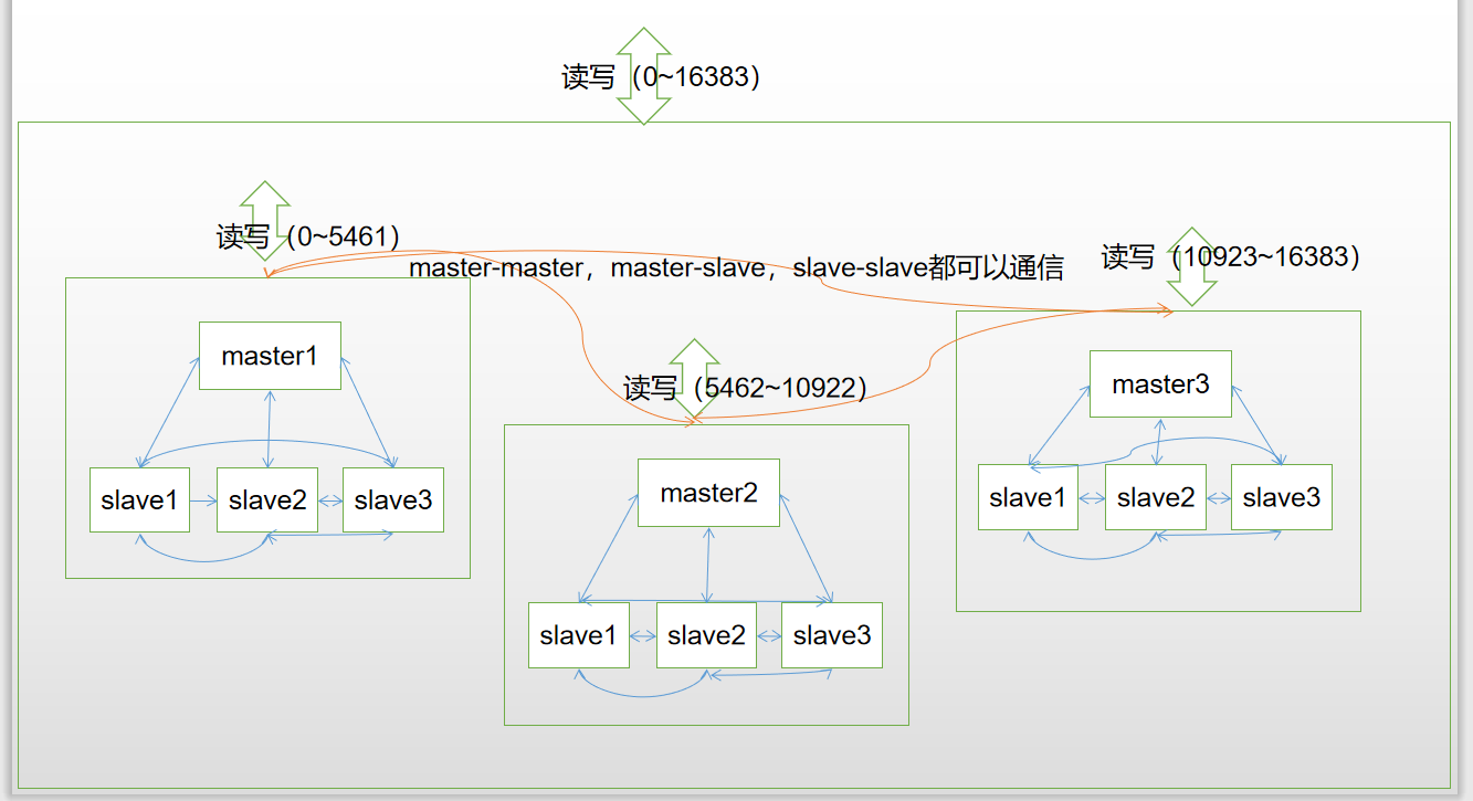 - 为了保证高可用,redis-cluster集群引入主从模式,一个主节点(master)对应多个从节点(slave),当主节点(master)宕机的时候将启用从节点(slave)。