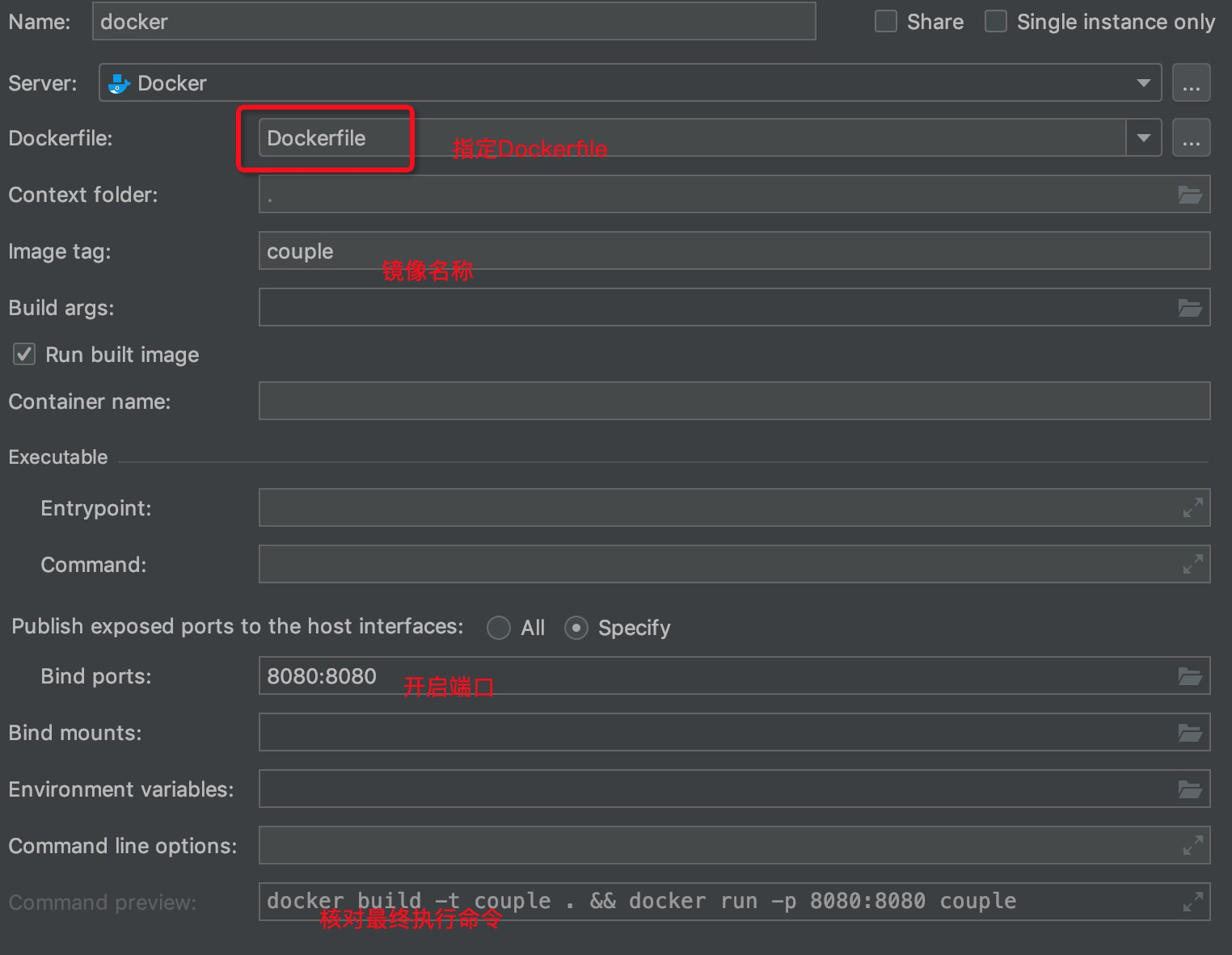 文件很简单,根据java:8 这个镜像创建,挂载数据卷,将本地 target/目录下的项目jar包拷贝过去 暴露端口8080 启动时执行couple.jar 大概是这样。