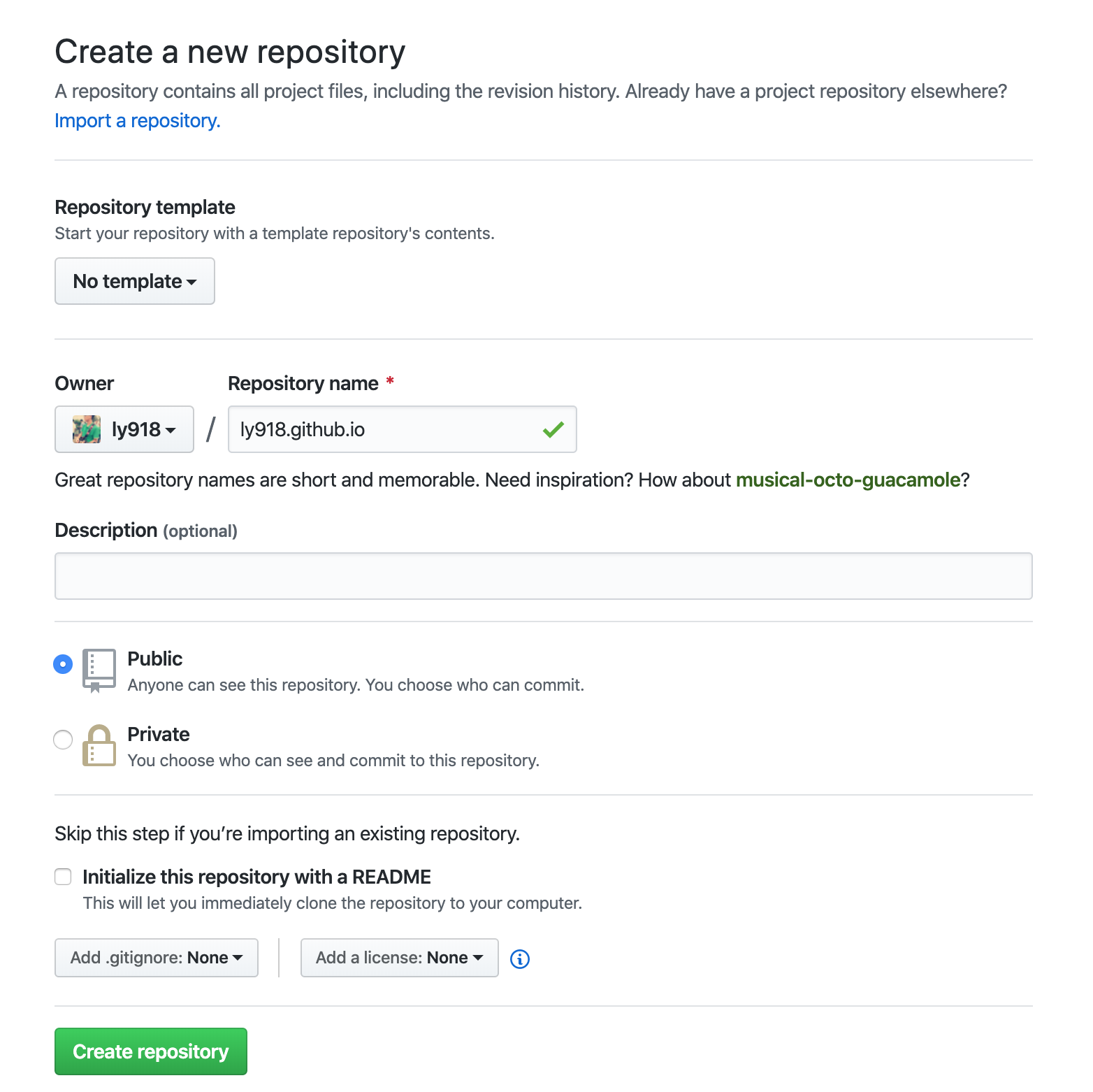 命名格式必须是这样的: 用户名.github.io,这也就是你个人主页的地址。例如我的用户名为ly918,则命名为"ly918.github.io"。如下图所示: