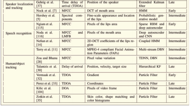 这些是目标定位,人员跟踪以及数据融合中的流行技术。它们可以在特征和决策级别上进行融合。例如,Loh等[39]结合了来自三个麦克风的音频数据和来自一个摄像机的视频数据来估计说话人的位置,然后使用卡尔曼滤波器来估计她/他的速度和加速度。