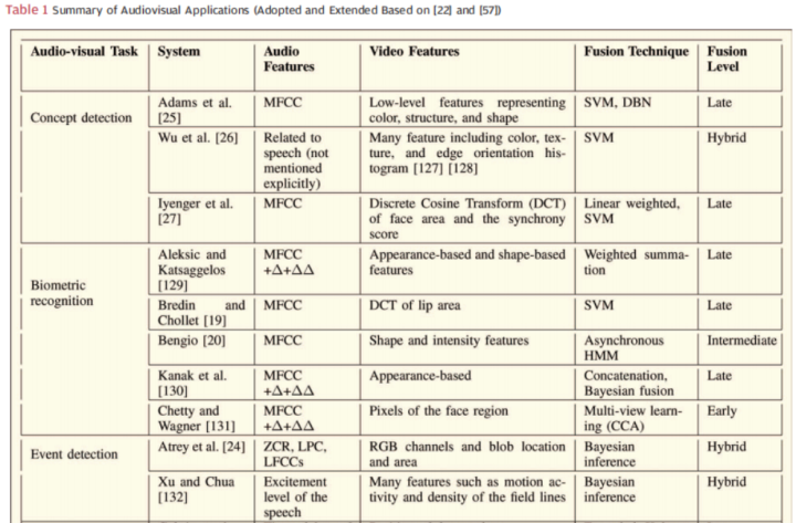设计视音频系统的一个重要问题是如何整合各种模态(在我们的示例中为音频和视频)的知识,以利用每种模态的信息知识,同时又忽略每种模态的弊端。 在下文中,描述了该领域中的一些主要挑战。