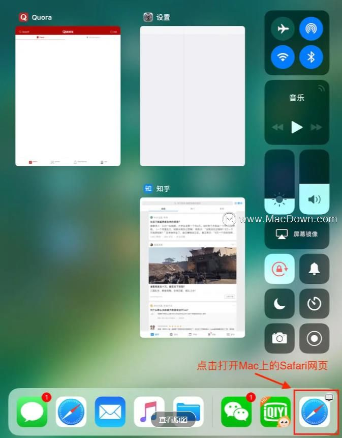 - 拿起你的iPhone/iPad设备,如果你的设备是最新的iOS 11,则双击Home键调出多任务管理界面,如果是iPhone,你会发现在屏幕的底部有一个关于Mac上打开的Safari网页的提示;