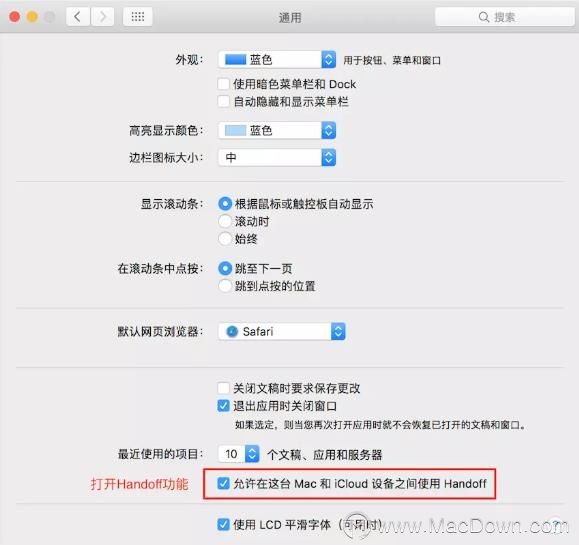 - 在Mac上,点击左上角的苹果图标进入“系统偏好设置---通用”,将“允许在这台Mac和iCloud设备之间使用Handoff”勾选上;