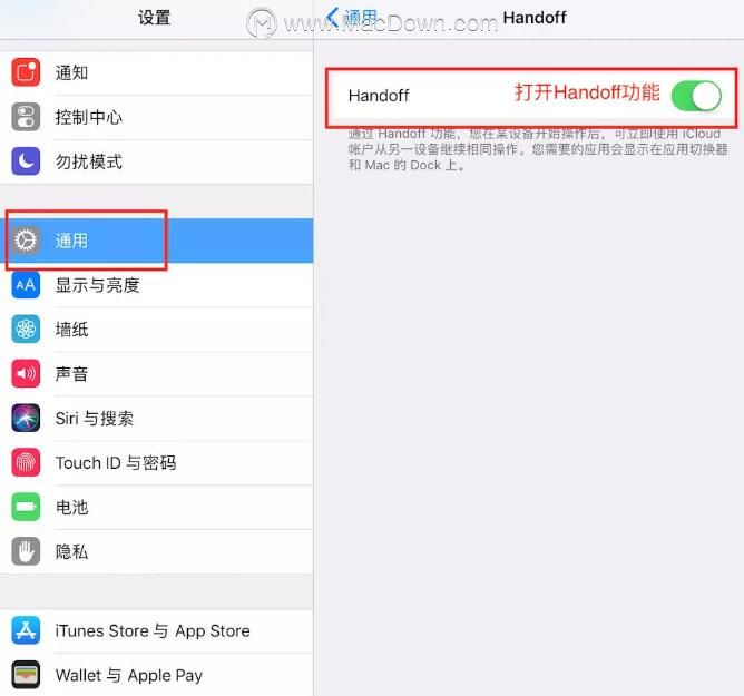 - 在iPhone/iPad设备上,进入“设置---通用---Handoff”,将Handoff功能打开。