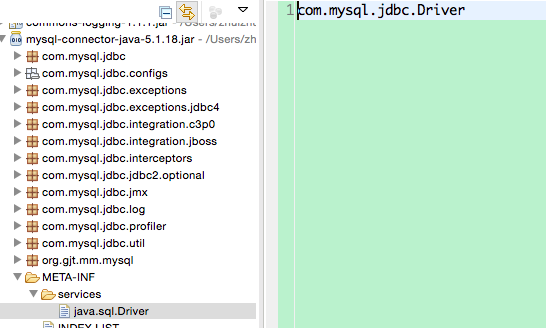 例如规范制定者在rt.jar包里面定义了数据库的驱动接口java.sql.Driver。那么MySQL实现的开发商则会在MySQL的驱动包的META-INF文件夹下建立名称为java.sql.Driver的文件,文件内容就是MySQL对java.sql.Driver接口的实现类,如下图: