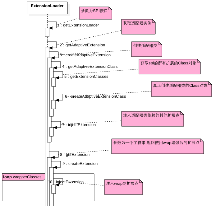 下面我们结合时序图来讲解ExtensionLoader的getAdaptiveExtension()方法是如何动态生成扩展接口对应的适配器类,以及getExtension方法如何根据扩展实现类的名称找到对应的实现类的: