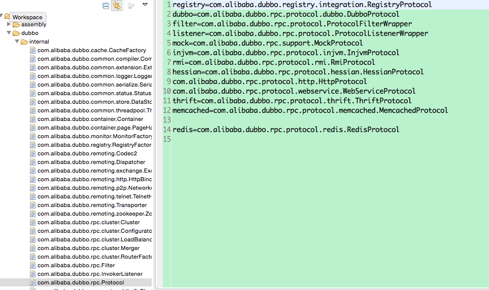 如上代码,拿Protocol协议来说,这里SPI注解为 @SPI("dubbo") ,那么这里 cachedDefaultName 就是Dubbo。然后 META-INF/dubbo/internal/ 、 META-INF/dubbo 、 META-INF/services/ 目录下去加载具体的扩展实体类,比如Protocol协议默认实现类如下: