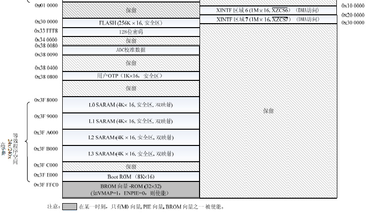 如图,为f28335的储存器映射图。10个片上SRAM(M1,M0,L0~L7),从XINTF外部接口扩展外部储存器空间。
