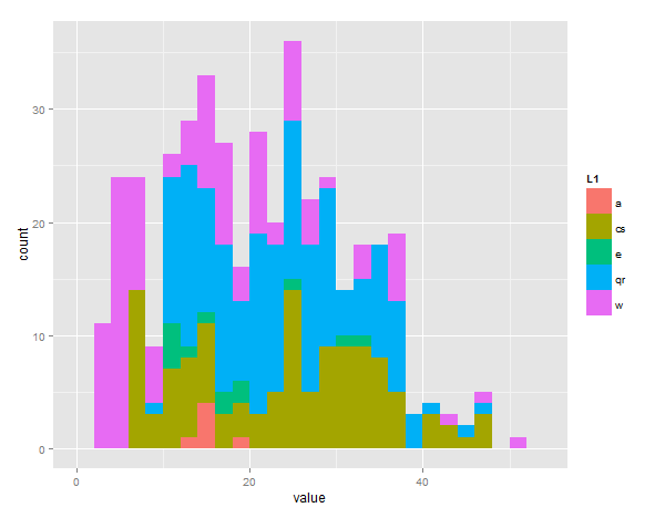 ggplot(melt(bucket), aes(value, fill = L1)) +