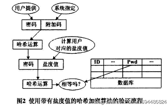 1)将用户提供的密码和系统生成的一个比较复杂的附加码(即盐值)进行结合,对结合的结果进行哈希运算;