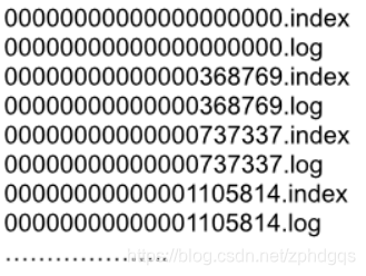 segment 是由index file和data file文件组成,此2个文件一一对应,成对出现,后缀".index"和“.log”分别表示为segment索引文件、数据文件,例如下:
