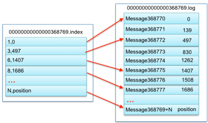 其中以索引文件中元数据3,497为例,依次在数据文件中表示第3个message(在全局partiton表示第368772个message),以及该消息的物理偏移地址为497