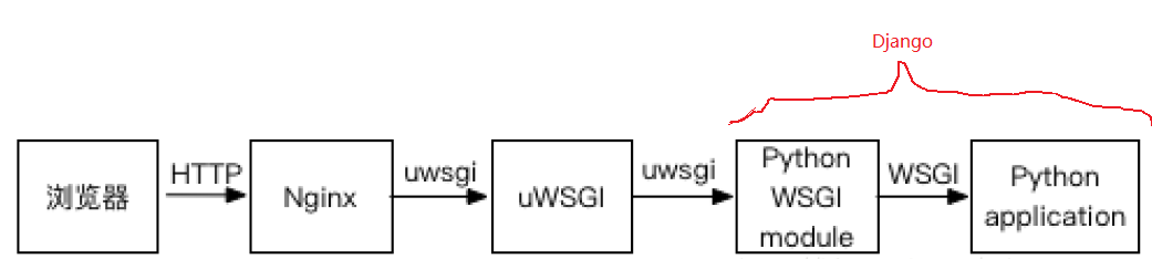 在一般的Python项目中大家会使用Nginx+uWSGI+Django,下面带大家看下整体的交互流程如下: