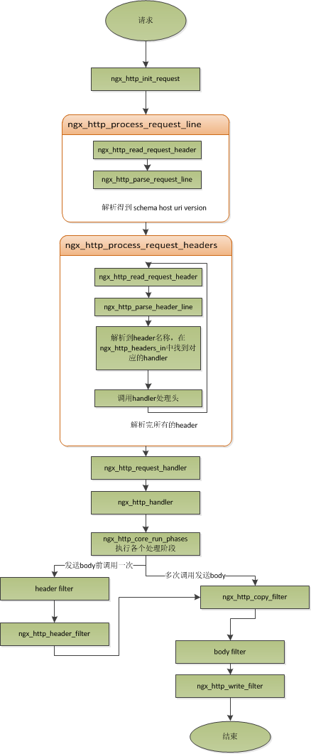 请求头处理完后,下面是真正处理请求体了,真正开始处理数据,是在ngx_http_handler这个函数里面,这个函数会设置write_event_handler为ngx_http_core_run_phases,并执行ngx_http_core_run_phases函数。ngx_http_core_run_phases这个函数将执行多阶段请求处理,nginx将一个http请求的处理分为多个阶段,那么这个函数就是执行这些阶段来产生数据。因为ngx_http_core_run_phases最后会产生数据,所以我们就很容易理解,为什么设置写事件的处理函数为ngx_http_core_run_phases了。在这里,我简要说明了一下函数的调用逻辑,我们需要明白最终是调用ngx_http_core_run_phases来处理请求,产生的响应头会放在ngx_http_request_t的headers_out中,这一部分内容,我会放在请求处理流程里面去讲。nginx的各种阶段会对请求进行处理,最后会调用filter来过滤数据,对数据进行加工,如truncked传输、gzip压缩等。这里的filter包括header filter与body filter,即对响应头或响应体进行处理。filter是一个链表结构,分别有header filter与body filter,先执行header filter中的所有filter,然后再执行body filter中的所有filter。在header filter中的最后一个filter,即ngx_http_header_filter,这个filter将会遍历所有的响应头,最后需要输出的响应头在一个连续的内存,然后调用ngx_http_write_filter进行输出。ngx_http_write_filter是body filter中的最后一个,所以nginx首先的body信息,在经过一系列的body filter之后,最后也会调用ngx_http_write_filter来进行输出。