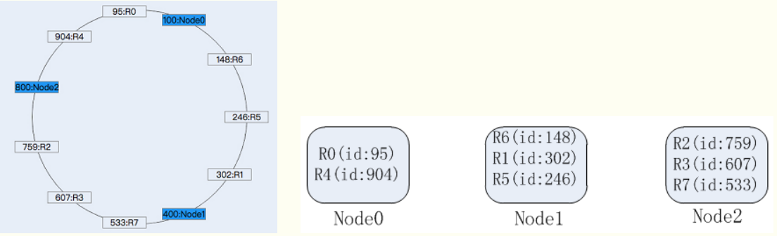 一致性hash是将数据按照特征值映射到一个首尾相接的hash环上,同时也将节点(按照IP地址或者机器名hash)映射到这个环上。对于数据,从数据在环上的位置开始,顺时针找到的第一个节点即为数据的存储节点。这里仍然以上述的数据为例,假设id的范围为[0, 1000],N0, N1, N2在环上的位置分别是100, 400, 800,那么hash环示意图与数据的分布如下: