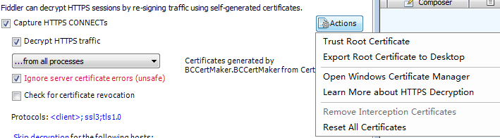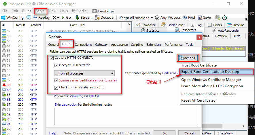 (6)果断的,打开fiddler,“Tools–Fiddler Options–HTTPS”,然后把下图中同样的地方勾上(注意一致),然后点击actions,然后先点击Trust Root…,然后,再点击Export Root…,此时,导出成功的话,在桌面就有你的证书了。务必注意:这一步成功的话,把第(7)步跳过,不要做了,直接进入第(8)步,如失败,请继续第(7步)。