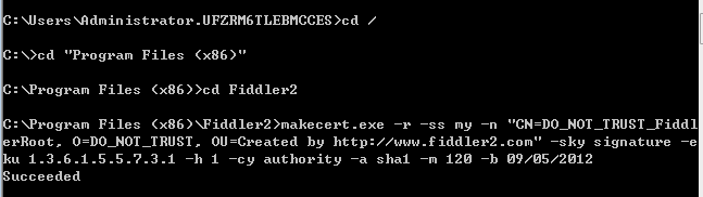 makecert.exe -r -ss my -n “CN=DO_NOT_TRUST_FiddlerRoot, O=DO_NOT_TRUST, OU=Created by http://www.fiddler2.com” -sky signature -eku 1.3.6.1.5.5.7.3.1 -h 1 -cy authority -a sha1 -m 120 -b 09/05/2012