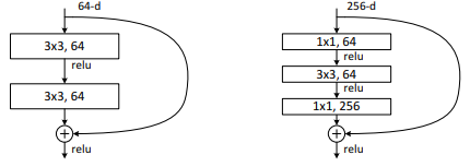 Figure 5. A deeper residual function F for ImageNet. Left: a building block (on 56×56 feature maps) as in Fig. 3 for ResNet34. Right: a “bottleneck” building block for ResNet-50/101/152.