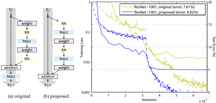 Figure 1. Left: (a) original Residual Unit in [1]; (b) proposed Residual Unit. The grey arrows indicate the easiest paths for the information to propagate, corresponding to the additive term “