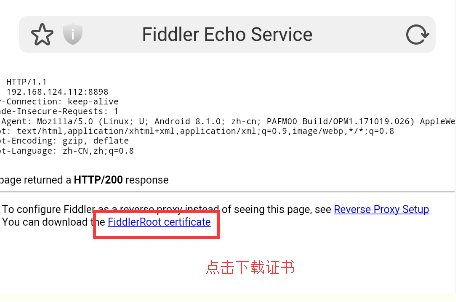 5、在手机浏览其中输入代理IP:8888直接访问代理提示安装fidder证书