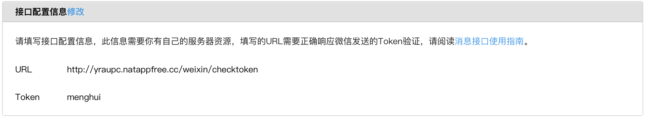 上面的代码写好后,就可以将完整的URL路径填写在接口配制信息中了。点击提交,成功后,变成不可输入的状态(可以点击修改进行更正,因为内网穿透服务每次重启,都会变化域名,所以这个修改还是很有用的)。