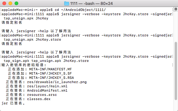 第三步:jarsigner -verbose -keystore JhcKey.store -signedjar tap_sign.apk tap_unsign.apk JhcKey.store