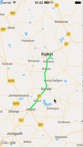 I have created animated polyline like CAShapeLayer by following code, I have added CAShapeLayer as sublayer to GMSMapiew but, if I move the map the layer won't moves. where to add the layer, so that it move along with map?