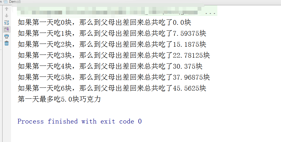 System.out.println("如果第一天吃"+key+"块,那么到父母出差回来总共吃了"+sum+"块");