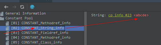 可以看到,上述字符串相加后,JVM还是一次性把 “abcde”加载到内存中,此时常量池中只有一个字符串变量,即 "abcde",如下所示: