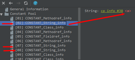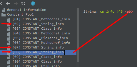 因为 String 是存放在常量池中的,虚拟机会对其进行优化,上面,虽然声明了 8 个变量,可是在常量池中只存放了 "a","b","ab" 这三个常量,使用 jclasslib 查看可知,如下所示: