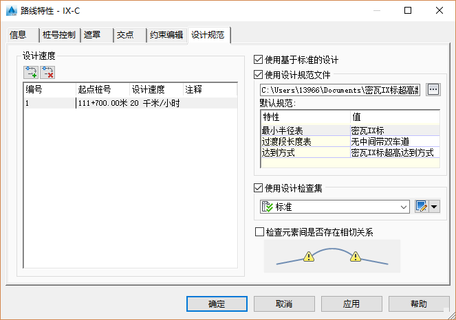 自动加宽需先给主路线添加速度与设计标准如下三张图,但自动加宽的手工模式(手动指定加宽段)可忽略选择标准文件直接执行“继续当前命令”: