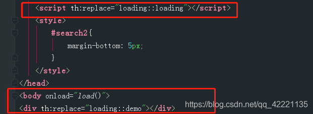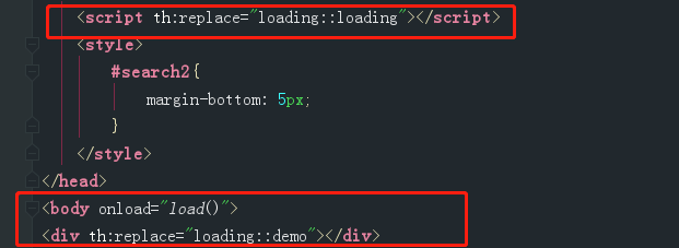 <!DOCTYPE html> <html xmlns:th="http://www.thymeleaf.org" xmlns:http="http://www.w3.org/1999/xhtml" xmlns:sec="http://www.thymeleaf.org/thymeleaf-extras-springsecurity4"> <head th:fragment="loading"> <style> #loading{ background-color: #FFFF; height: 100%; width: 100%; position: fixed; z-index: 999; margin-top: 0px; top: 0px; } #loading-center{ width: 100%; height: 100%; position: relative; } #loading-center-absolute { position: absolute; left: 50%; top: 50%; height: 150px; width: 150px; margin-top: -75px; margin-left: -75px; -moz-border-radius: 50% 50% 50% 50%; -webkit-border-radius: 50% 50% 50% 50%; border-radius: 50% 50% 50% 50%; transform: scale(0.3,0.3); } .object{ width: 20px; height: 20px; background-color: rgba(11, 0, 17, 0.46); position: absolute; -moz-border-radius: 50% 50% 50% 50%; -webkit-border-radius: 50% 50% 50% 50%; border-radius: 50% 50% 50% 50%; -webkit-animation: animate 0.8s infinite; animation: animate 0.8s infinite; } #object_one { top: 19px; left: 19px; } #object_two { top: 0px; left: 65px; -webkit-animation-delay: 0.1s; animation-delay: 0.1s; } #object_three { top: 19px; left: 111px; -webkit-animation-delay: 0.2s; animation-delay: 0.2s; } #object_four { top: 65px; left: 130px; -webkit-animation-delay: 0.3s; animation-delay: 0.3s; } #object_five { top: 111px; left: 111px; -webkit-animation-delay: 0.4s; animation-delay: 0.4s; } #object_six { top: 130px; left: 65px; -webkit-animation-delay: 0.5s; animation-delay: 0.5s; } #object_seven { top: 111px; left: 19px; -webkit-animation-delay: 0.6s; animation-delay: 0.6s; } #object_eight { top: 65px; left: 0px; -webkit-animation-delay: 0.7s; animation-delay: 0.7s; } @-webkit-keyframes animate { 25% { -ms-transform: scale(1.5); -webkit-transform: scale(1.5); transform: scale(1.5); } 75% { -ms-transform: scale(0); -webkit-transform: scale(0); transform: scale(0); } } @keyframes animate { 50% { -ms-transform: scale(1.5,1.5); -webkit-transform: scale(1.5,1.5); transform: scale(1.5,1.5); } 100% { -ms-transform: scale(1,1); -webkit-transform: scale(1,1); transform: scale(1,1); } } </style> <script type="text/javascript"> function load() { var loading = document.getElementById('loading'); //设置透明度改变的过渡时间为0.3秒 var a= setTimeout("loading.style.transition='opacity 0.3s'",0); //0.5秒后加载动画开始变为透明 var b= setTimeout("loading.style.opacity=0",500); //当透明度为0的时候,隐藏掉它 var c= setTimeout("loading.style.display='none'",800) } </script> </head> <div id="loading" th:fragment="demo"> <div id="loading-center"> <div id="loading-center-absolute"> <div class="object" id="object_one"></div> <div class="object" id="object_two"></div> <div class="object" id="object_three"></div> <div class="object" id="object_four"></div> <div class="object" id="object_five"></div> <div class="object" id="object_six"></div> <div class="object" id="object_seven"></div> <div class="object" id="object_eight"></div> </div> </div> </div> </html>文件为html文本内容其中使用了thymeleaf的模块化使用时用th:replace引入模块即可