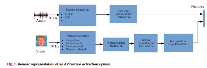 AV特征提取系统的一般表示如图1所示。在大多数情况下,在提取视觉特征之后会考虑降维步骤。为了捕获音频和视频流中的时间动态,从新功能中获取了一阶和二阶导数(通过差异实现)。由于通常音频和视频流的速率不同,因此需要插值步骤以相同的速率表示它们。
