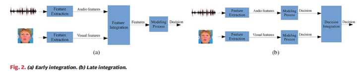 早期集成方法的说明如图2(a)所示。可以看出,首先从这两种模态中提取了适当的特征。 然后,在称为特征集成的过程中,将提取的特征组合为一个特征集。 例如,将输入特征向量堆叠为单个向量是特征整合的最简单形式之一。集成的特征向量将输入到建模过程中,该过程将产生最终决策或输出。