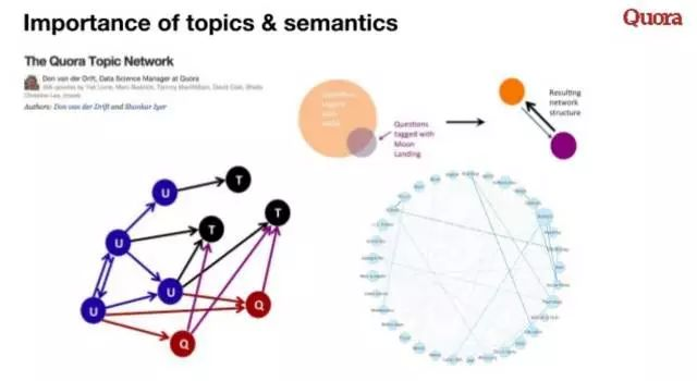 - Topic是对一个主题内容的聚合,Topic在Quora的信息架构里面承载着极其重要的角色,是知识结构的骨架,Quora管这个叫做Topic Network,如何构建Topic Network本身就是一个非常大的挑战,另外还需要解决的问题包括,如何把Topic下(潜在)优质的问题发掘出来,以及如何把水问题降权和过滤/合并重复问题等。